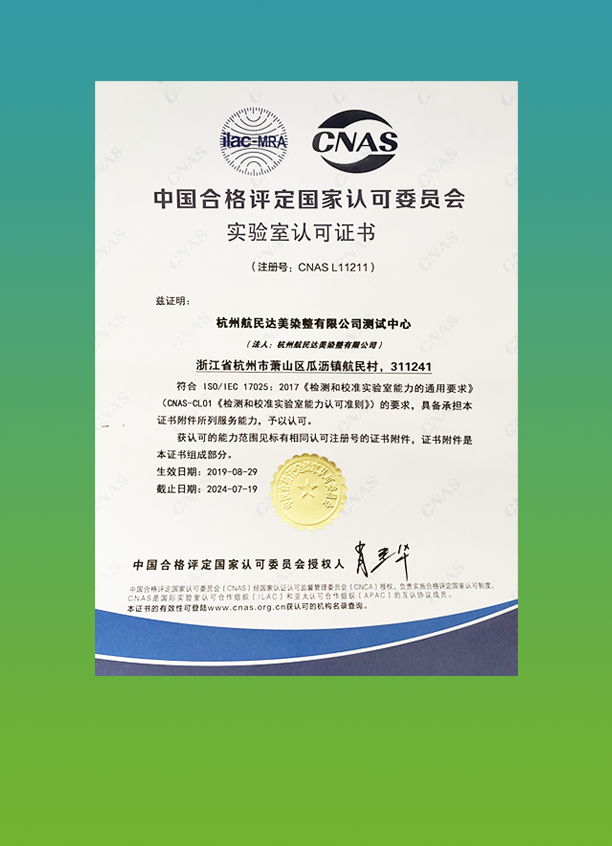 The testing center of Hangzhou Hangmin Damei dyeing and finishing Co., Ltd. is a laboratory accredited by China National Accreditation Service for conformity assessment (CNAs). The accredited testing capabilities include 26 items in 9 categories, including pilling, stretching and tearing.